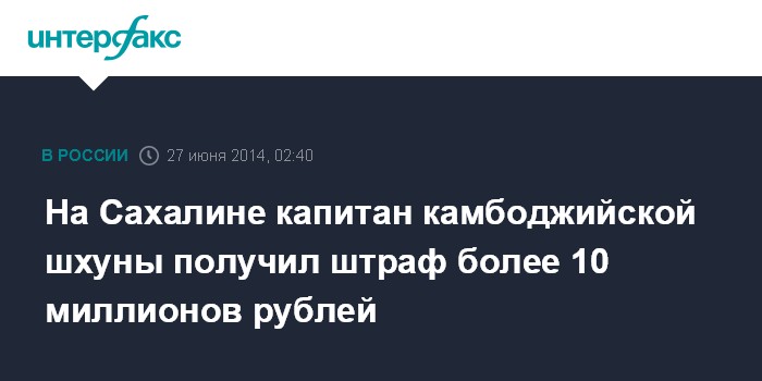 Москва. 27 июня. INTERFAX.RU - Капитан иностранной рыболовецкой шхуны "Вирт", задержанной пограничниками за браконьерство краба вблизи Сахалина, отштрафован на 11 млн рублей, сообщается на сайте главной военной прокуратуры РФ.