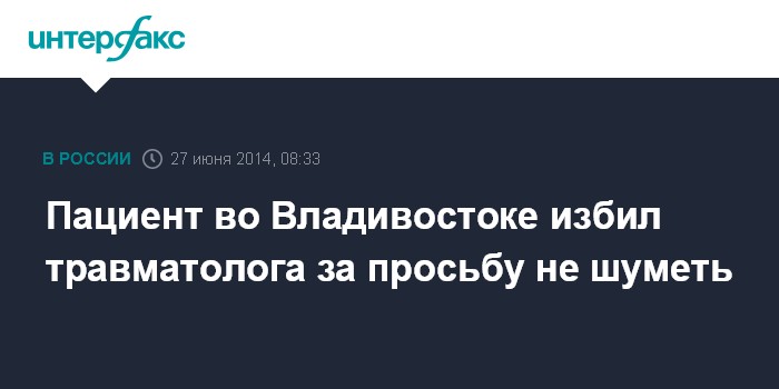 "Полицейские установили, что врач-травматолог, дежуривший в "тысячекоечной" больнице, сделал замечание шумному пациенту. В ответ 32-летний житель Дальнегорского района Приморья несколько раз ударил врача в голову и в грудь ", - сообщила "Интерфаксу" представитель пресс-службы УМВД Владивостока.