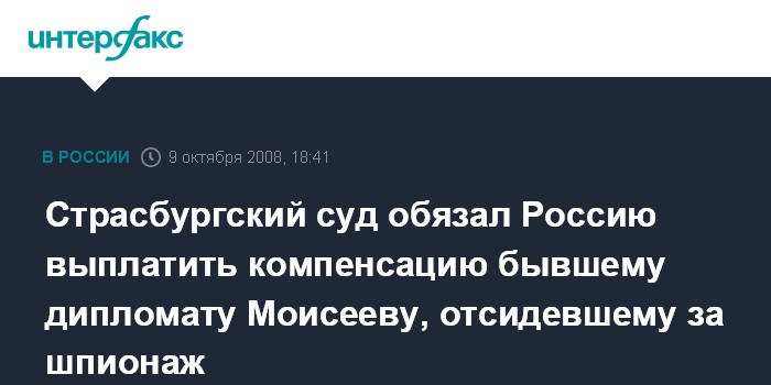 Москва. 9 октября. INTERFAX.RU - Европейский суд по правам человека в Страсбурге обязал Россию выплатить 25 тыс. евро бывшему российскому дипломату Валентину Моисееву, который был осужден за шпионаж.