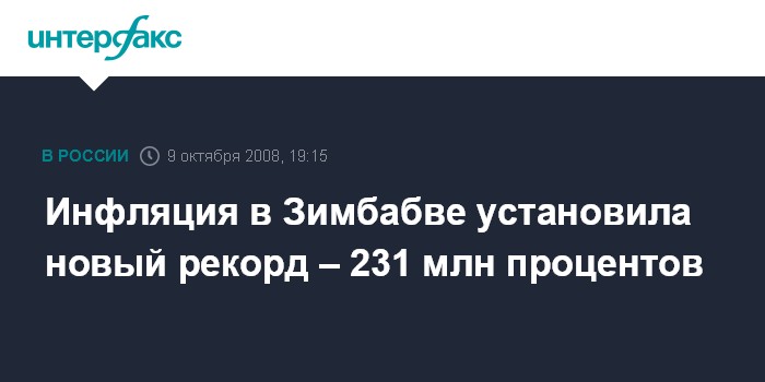 Инфляция в Зимбабве установила новый рекорд – 231 млн процентов