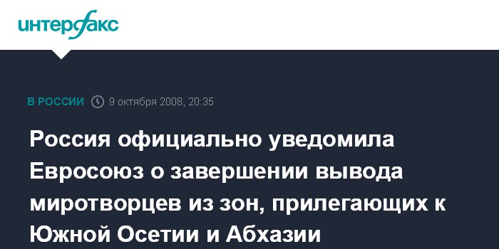 "9 октября постоянное представительство РФ при Европейских сообществах в Брюсселе передало в генеральный секретариат Совета Европейского союза ноту, уведомляющую о завершении вывода российских миротворческих сил из зон, прилегающих к Южной Осетии и Абхазии, что соответствует положениям документов Дмитрия Медведева - Николя Саркози от 12 августа и 8 сентября 2008 года", - говорится в сообщении МИД РФ.