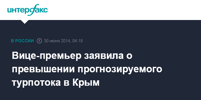 Москва. 30 июня. INTERFAX.RU - Курортный сезон в Крыму начался успешно, заявила вице-премьер РФ Ольга Голодец в интервью, которое публикует в понедельник газета "Коммерсантъ".