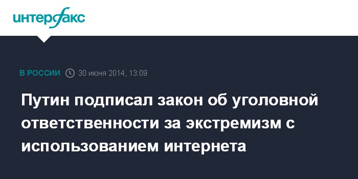 Москва. 30 июня. INTERFAX.RU - Президент РФ Владимир Путин подписал закон, вводящий уголовную ответственность за призывы к экстремистской деятельности с использованием интернета, сообщает официальный интернет-портал правовой информации.
