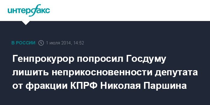 Москва. 1 июля. INTERFAX.RU - Генеральный прокурор России Юрий Чайка направил в Госдуму представление о лишении неприкосновенности депутата от фракции КПРФ Николая Паршина, сообщили "Интерфаксу" в Генпрокуратуре РФ во вторник.