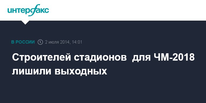 Москва. 2 июля. INTERFAX.RU - Работники, которые трудятся на строительстве объектов для Кубка Конфедераций и для Чемпионата мира по футболу - 2018, лишились гарантий на выходные и отдых в ночное время и праздники. Такие поправки правительство РФ внесло в Трудовой кодекс. Кроме того, теперь строителям имеют право не оплачивать сверхурочную работу. Данное распоряжение было опубликовано на сайте правительства 2 июля.