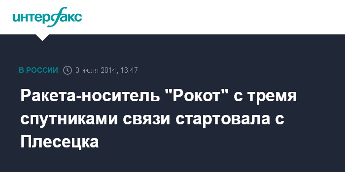 Москва. 3 июля. INTERFAX.RU - Боевой расчет Войск воздушно-космической обороны (ВВКО) выполнил в четверг пуск с космодрома Плесецк ракеты-носителя "Рокот" с тремя спутниками связи "Гонец-М", сообщил "Интерфаксу" официальный представитель ВВКО полковник Алексей Золотухин. Ракета была запущена в 16:43 по московскому времени.