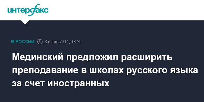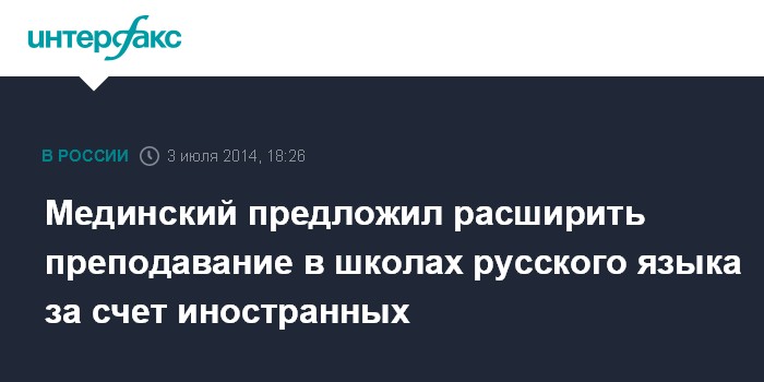 Москва. 3 июля. INTERFAX.RU - Министр культуры Владимир Мединский призывает министерство образования изменить соотношение часов преподавания русского и иностранных языков в пользу уроков русского языка.