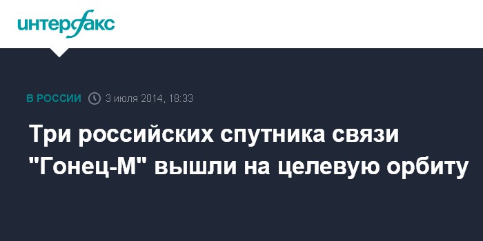 Москва. 3 июля. INTERFAX.RU - Стартовавшая в четверг с космодрома Плесецк ракета-носитель "Рокот" в расчетное время успешно вывела на целевую орбиту три спутника связи "Гонец-М", сообщил "Интерфаксу-АВН" официальный представитель Войск воздушно-космической обороны полковник Алексей Золотухин.