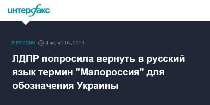 Москва. 4 июля. INTERFAX.RU - Зампред комитета Госдумы по науке и наукоемким технологиям Михаил Дегтярев (партия ЛДПР) направил Институту русского языка им. В. В. Виноградова РАН обращение с просьбой вернуть в русский язык термин "Малороссия" для обозначения Украины. Об этом пишут "Известия" со ссылкой на копию документа.