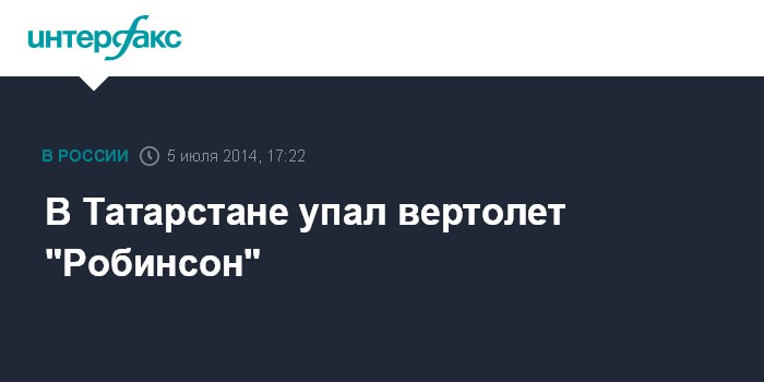 Как рассказали "Интерфаксу" в пресс-службе СК РФ, вертолет "Робинсон", принадлежащий компании "АК БАРС АЭРО", потерпел крушение в Новошешминском районе республики 5 июля в 15:00. По словам собеседника агентства, по предварительным данным, пилот в тяжелом состоянии доставлен в больницу.
