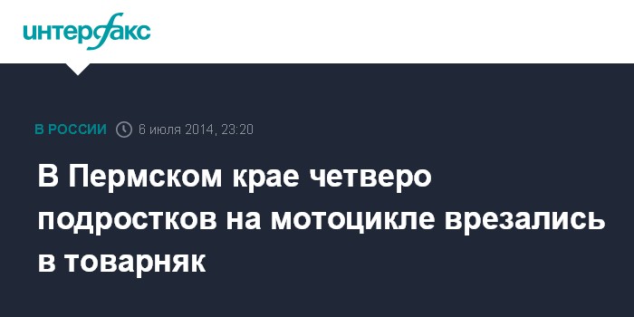 Москва. 6 июля. INTERFAX.RU - В воскресенье в районе деревни Большой Сарс Пермского мотоцикл с коляской врезался в товарный поезд.