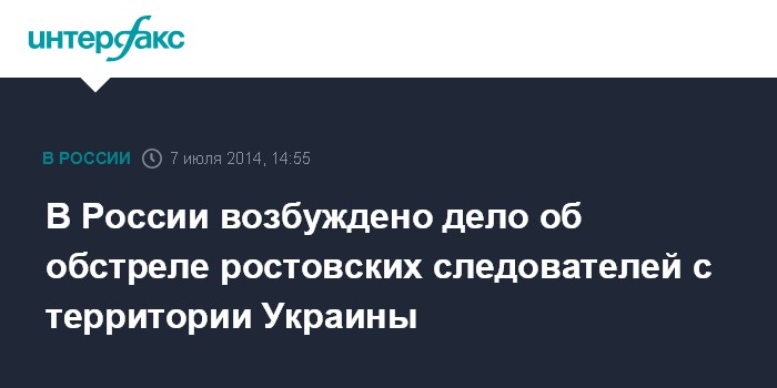 Москва. 7 июля. INTERFAX.RU - Следственный комитет РФ возбудил уголовное дело по факту обстрела с территории Украины следственно-оперативной группы в Ростовской области, сообщил в субботу "Интерфаксу" официальный представитель СКР Владимир Маркин.