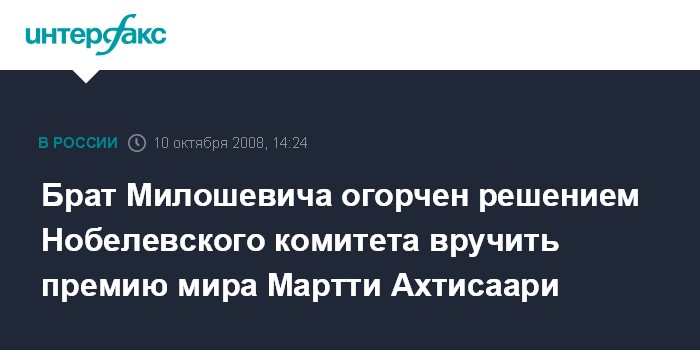 Москва. 10 октября. INTERFAX.RU - Брат экс-президента Югославии Слободана Милошевича, бывший посол Югославии в Москве Борислав Милошевич назвал незаслуженным присуждение Мартти Ахтисаари Нобелевской премии мира.