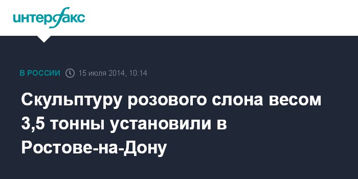Москва. 15 июля. INTERFAX.RU - В Железнодорожном районе Ростова-на-Дону установлена бетонная скульптура розового слона весом 3,5 тонны и высотой 4,5 метра, сообщает пресс-служба городской администрации.