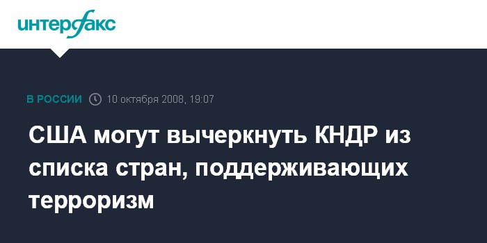 Москва. 10 октября. INTERFAX.RU - Администрация президента США Джорджа Буша, возможно, уже в пятницу удалит Северную Корею из списка государств, поддерживающих терроризм, сообщает газета Washington Post.