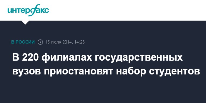Москва. 15 июля. INTERFAX.RU - Набор студентов в этом году будет приостановлен в 220 филиалах российских государственных вузов, которые будут реорганизованы, заявил глава Минобрнауки Дмитрий Ливанов.