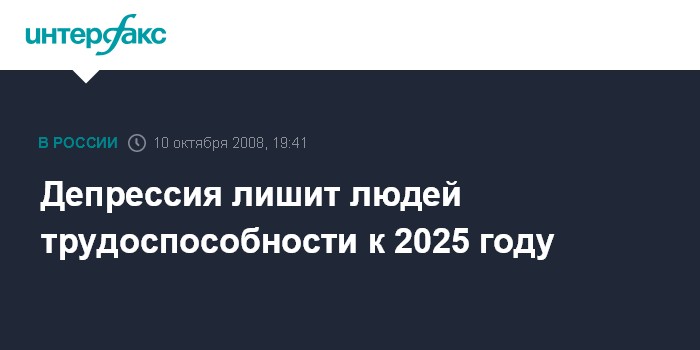 Москва. 10 октября. INTERFAX.RU - К 2025 г. депрессии будут главной причиной трудовых потерь в мире, считает директор Государственного научного центра социальной и судебной психиатрии им. Сербского Татьяна Дмитриева.