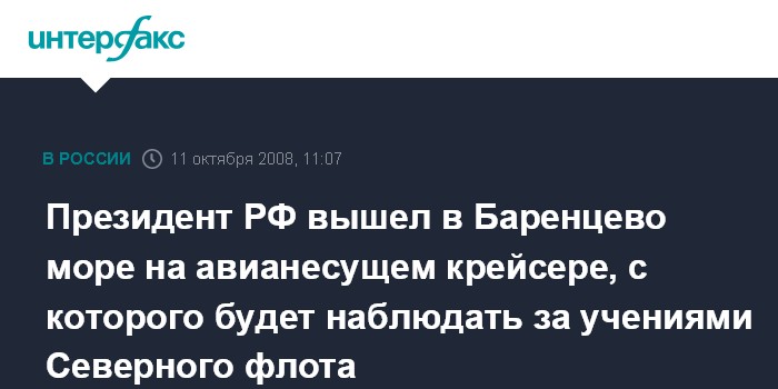 Москва. 11 октября. INTERFAX.RU - Президент России Дмитрий Медведев прибыл в субботу на тяжелый авианесущий крейсер "Адмирал Флота Советского Союза Кузнецов", базирующийся в Североморске.