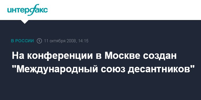 Москва. 11 октября. INTERFAX.RU - "Международный союз десантников" создан в субботу в Москве. Об этом объявлено на первой международной учредительной конференции, в которой участвуют представители общественных ветеранских объединений воздушно-десантных и аэромобильных войск и спецназа России, Украины, Белоруссии, Казахстана, Латвии, Молдавии, Узбекистана, Абхазии, Южной Осетии и Приндестровской Молдавской республики.