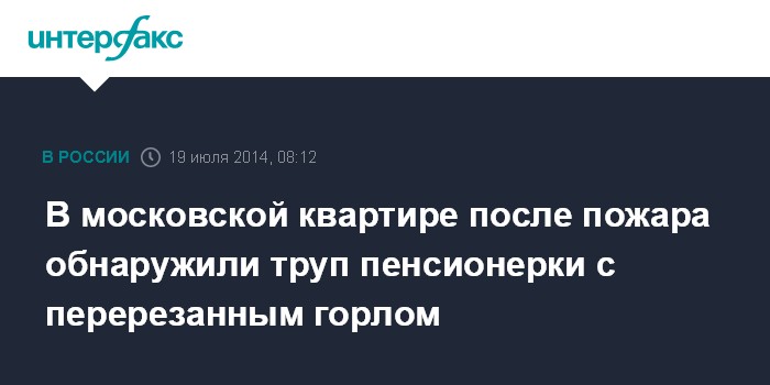 Москва. 19 июля. INTERFAX.RU - В квартире жилого дома в центре Москвы после пожара обнаружено тело пенсионерки с перерезанным горлом и ранами на голове. Об этом "Интерфаксу" сообщил источник в правоохранительных органах.