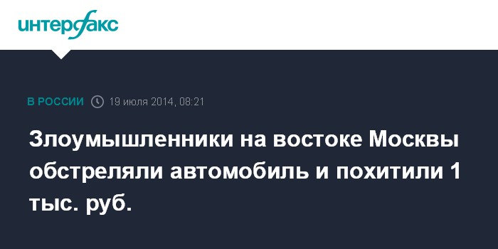 Москва. 19 июля. INTERFAX.RU - Четверо неизвестных на востоке Москвы обстреляли Renault и похитили из него сумку, в которой находились документы и 1 тыс. руб. ОБ этом "Интерфаксу" сообщили в пресс-службе ГУ МВД РФ по Москве.