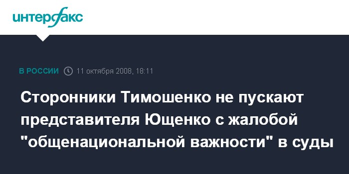 Москва. 11 октября. INTERFAX.RU - Руководитель службы по представительству в судах интересов президента Украины и созданных им консультативных, совещательных и других вспомогательных органов и служб секретариата президента Руслан Кирилюк сообщил агентству "Интерфакс-Украина", что представитель Виктора Ющенко из-за блокирования не может попасть в здание суда.
