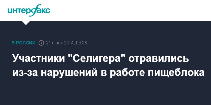 Москва. 21 июля. INTERFAX.RU - 142 участника молодежного форума "Селигер" отравились пищей, из них 34 были госпитализированы, сообщили "Интерфаксу" в понедельник в Роспотребнадзоре. По предварительным результатам проверки были выявлены грубые санитарные нарушения в работе пищеблока.
