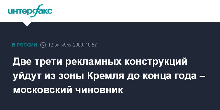 Москва. 12 октября. INTERFAX.RU - Почти две трети рекламных конструкций в охранной зоне Московского Кремля будут демонтированы до 1 января 2009 года, сообщил "Интерфаксу" глава комитета рекламы, информации и оформления города Владимир Макаров.