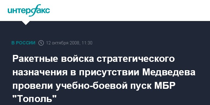 Космодром Плесецк. 12 октября. INTERFAX.RU - В ходе учений "Стабильность 2008" Ракетными войсками стратегического назначения, в присутствии Верховного главнокомандующего, президента России Дмитрия Медведева, проведен учебно-боевой пуск межконтинентальной баллистической ракеты РС-12М "Тополь".