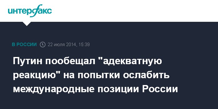 Москва. 22 июля. INTERFAX.RU - Президент Владимир Путин заявил, что Россия будет адекватно реагировать на попытки извне ослабить ее позиции на международной арене. По его словам, такие попытки осуществляются с помощью спецслужб, "карманных НКО" и других методов.