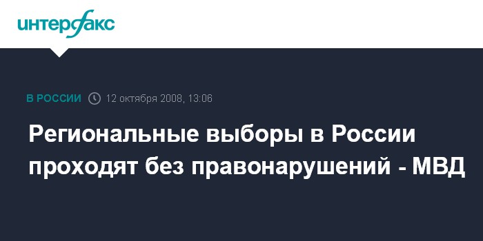 Москва. 12 октября. INTERFAX.RU - Никаких сообщений о нарушениях законодательства в ходе выборов в российских регионах на данный момент не поступало, сообщил исполняющий обязанности начальника департамента охраны общественного порядка МВД России Михаил Артамошкин.