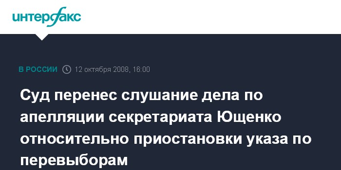 Киев. 12 октября. INTERFAX.RU - Киевский апелляционный административный суд перенес слушание дела по апелляции секретариата президента Украины на определение Окружного админсуда Киева о приостановлении действия указа о досрочном прекращении полномочий Верховной Рады Украины и внеочередных парламентских выборах на понедельник, 13 октября, на 16.00.