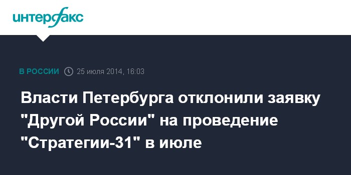 Москва. 25 июля. INTERFAX.RU - Комитет по вопросам законности, правопорядка и безопасности Санкт-Петербурга отклонил заявку незарегистрированной политической партии "Другая Россия" на проведение акции "Стратегия-31", сообщил "Интерфаксу" координатор партии в северной столице Андрей Дмитриев в пятницу.