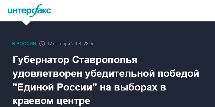 Ставрополь. 12 октября. ИНТЕРФАКС - Губернатор Ставропольского края Валерий Гаевский считает победу партии "Единая Россия" на выборах 12 октября в Ставрополе убедительной.