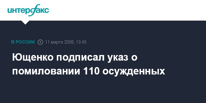 Киев. 11 марта. INTERFAX.RU - Президент Украины Виктор Ющенко подписал указ о помиловании 110 осужденных, сообщает во вторник пресс-служба президента.