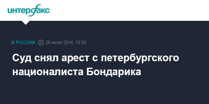 Москва. 28 июля. INTERFAX.RU - Городской суд Санкт-Петербурга отменил решение суда первой инстанции о продлении содержания под стражей председателя общественного движения "Русская партия" Николая Бондарика, обвиняемого в экстремизме.