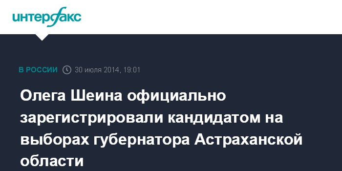 Москва. 30 июля. INTERFAX.RU - Избирательная комиссия Астраханской области в среду зарегистрировала лидера астраханского отделения "Справедливой России" депутата областной думы Олега Шеина в качестве кандидата на пост губернатора региона, сообщил агентству "Интерфакс-Юг" зампредседателя облизбиркома Владимир Золотокопов.