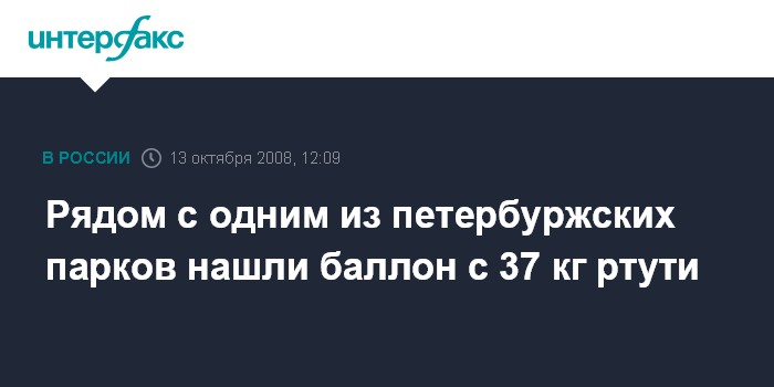 Москва. 13 октября. INTERFAX.RU - Бесхозный баллон с 37 кг ртути был найден возле одного из крупнейших петербургских парков в конце сентября, сообщил "Интерфаксу" начальник оперативной службы ГУП "Инженерный центр экологических работ" Александр Ерофеев. По его словам, баллон был обнаружен 26 сентября на Hежинской улице возле Удельного парка в Выборгском районе.