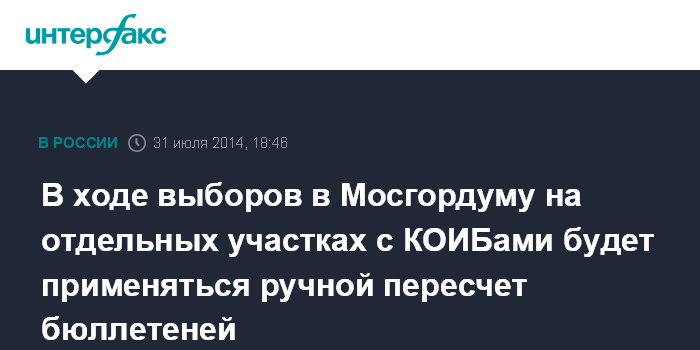 Москва. 31 июля. INTERFAX.RU - На ряде участков, где на предстоящих 14 сентября выборах депутатов Мосгордумы будут использоваться комплексы обработки избирательных бюллетеней (КОИБы), бюллетени будут пересчитаны вручную. Соответствующее решение принял Мосгоризбирком на заседании в четверг.
