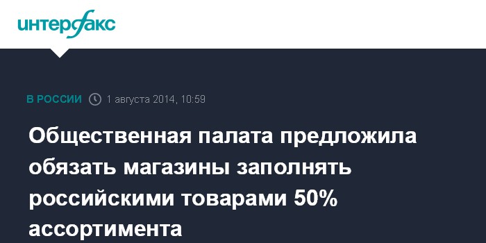 Москва. 1 августа. INTERFAX.RU - В законодательство России нужно внести положение, обязывающее торговые сети обеспечивать не менее половины своего ассортимента товарами отечественного производства, считает председатель Комиссии Общественной палаты РФ по социальной поддержке граждан и качеству жизни Владимир Слепак.