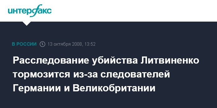 "Дело очень серьезное. Сейчас наше расследование застопорилось, потому что наши международные поручения, которые мы направляли в различные европейские государства, в том числе и в Германию, в полной мере до сих пор не исполнены, - сказал Бастрыкин в интервью, опубликованном в немецкой газете "Зюддойче Цайтунг". - Например, у нас до сих пор нет результатов вскрытия, которое было проведено в Соединенном королевстве Великобритании и Северной Ирландии".