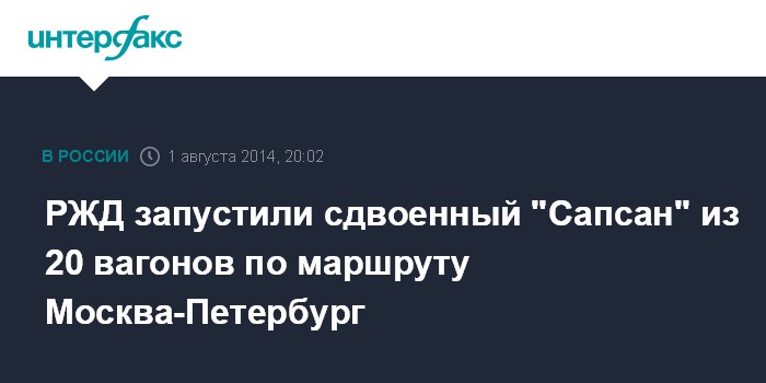 Москва. 1 августа. INTERFAX.RU - ОАО "Российские железные дороги" пустило сдвоенный поезд "Сапсан" из 20 вагонов по маршруту Москва - Санкт-Петербург, сообщил корреспондент "Интерфакса" с церемонии запуска.
