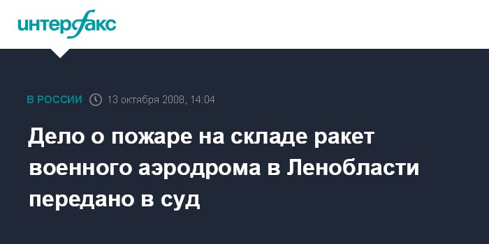 Москва. 13 октября. INTERFAX.RU - Следственное управления по Ленинградскому военному округу передало в суд дело о пожаре на складе ракет в Лодейном поле, в результате которого было уничтожено около 450 снарядов. Обвинение по статье 217 УК РФ (нарушение правил безопасности на взрывоопасных объектах) было предъявлено прапорщику, начальнику склада.