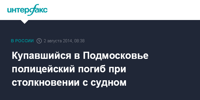 Москва. 2 августа. INTERFAX.RU - Московский полицейский погиб в Оке в подмосковном Серпухове в результате столкновения с судном, сообщили "Интерфаксу" в пресс-службе столичного ГУ МВД РФ.