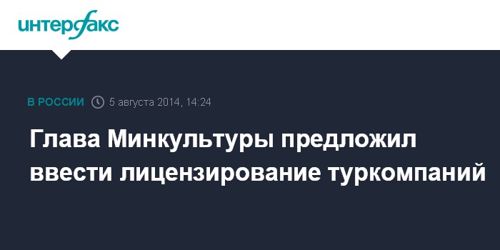 Москва. 5 августа. INTERFAX.RU - Министр культуры РФ Владимир Мединский считает необходимым ввести лицензирование туркомпаний для того, чтобы в полной мере защитить туристов. Об этом он во вторник заявил журналистам.