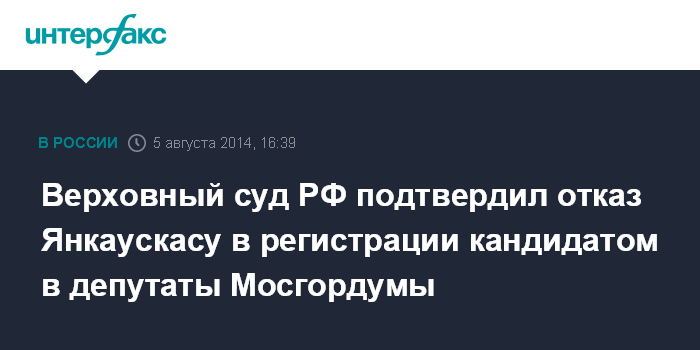 Москва. 5 августа. INTERFAX.RU - Верховный суд РФ не нашел нарушений в действии окружной избирательной комиссии по отношению к муниципальному депутату Константину Янкаускасу, пытавшемуся зарегистрироваться в качестве кандидата в депутаты Мосгордумы.
