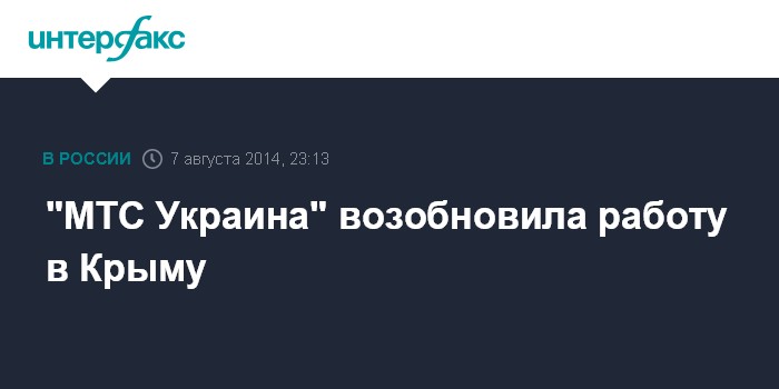 Москва. 7 августа. INTERFAX.RU - Компания "МТС Украина" с 20:30 по московскому времени возобновила предоставление услуг абонентам Крыма, говорится в пресс-релизе компании, обнародованном в четверг.
