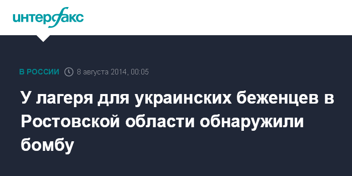 Москва. 8 августа. INTERFAX.RU - Самодельное взрывное устройство было обнаружено возле одного из лагерей украинских беженцев близ пункта пропуска Гуково (Ростовская область), сообщили "Интерфаксу" в правоохранительных органах.