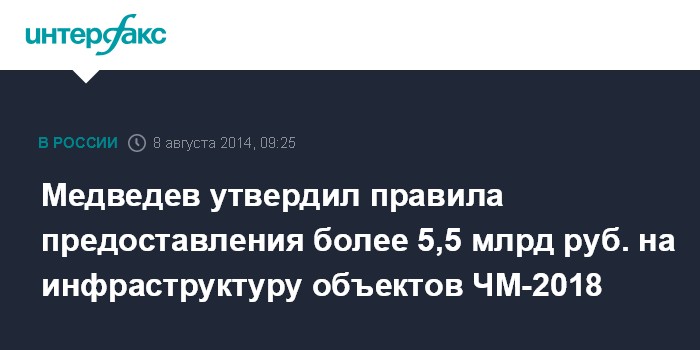 Москва. 8 августа. INTERFAX.RU - Премьер-министр РФ Дмитрий Медведев подписал постановление правительства, утверждающее правила предоставления субсидий общим объемом свыше 5,5 млрд руб. на инфраструктуру спортивных объектов чемпионата мира по футболу в 2018 году в России. Документ был внесен Минстроем России.