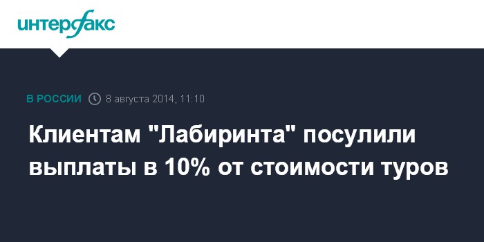 Москва. 8 августа. INTERFAX.RU - Клиенты туроператора "Лабиринт", возможно, получат только 10% компенсаций от стоимости тура, сообщила в пятницу Ассоциация туроператоров России (АТОР).